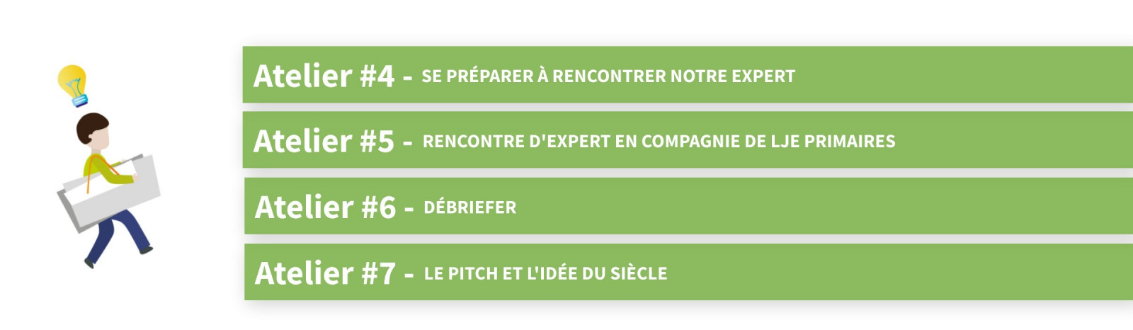 Futur Défi se divise en cinq grandes étapes elles-mêmes divisées en ateliers.