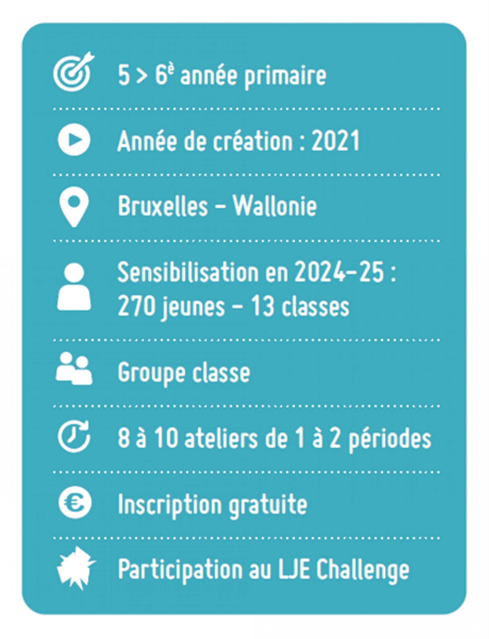 Le programme est divisé en 5 étapes. A chaque moment clef un animateur de LJE Primaire vient en classe soutenir et orienter la classe.