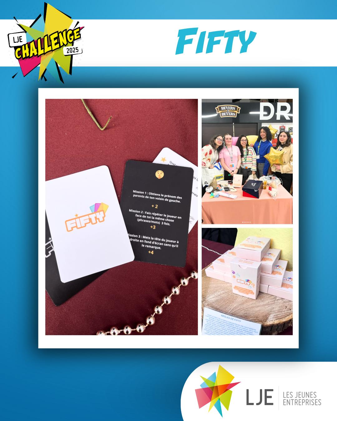 Fifty est un jeu de cartes créé par six amies. Conçu pour réunir petits et grands loin des écrans, Fifty valorise la convivialité, le partage et l'apprentissage. Avec des défis stimulants et accessibles à tous, ce jeu invite à passer des moments de qualité entre amis ou en famille, tout en s'amusant et en se creusant les méninges.
